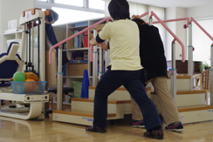 【階段昇降】階段昇降訓練器を使って、階段昇降の自立、継続の訓練をします。